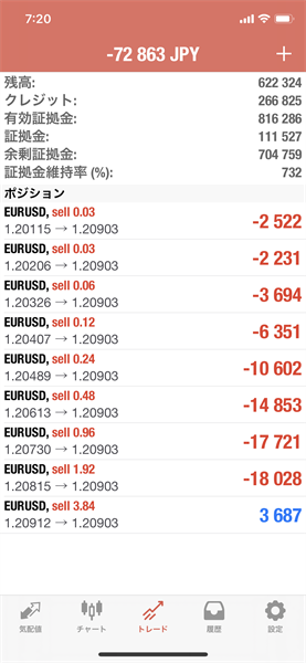 下記はトレード中の損益です。この時は、約7万円の含み損となっています。最大15万円程度まで含み損が発生しました。
