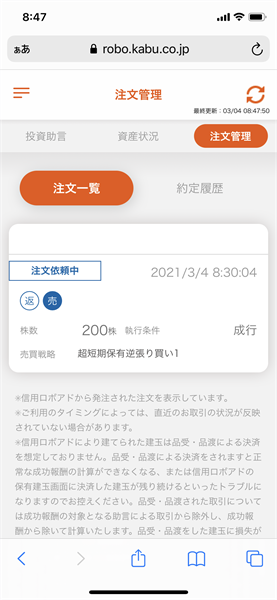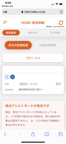 いつものように投資助言を確認。昨日、新規で買った銘柄が成行で「返済売り」となっていました。