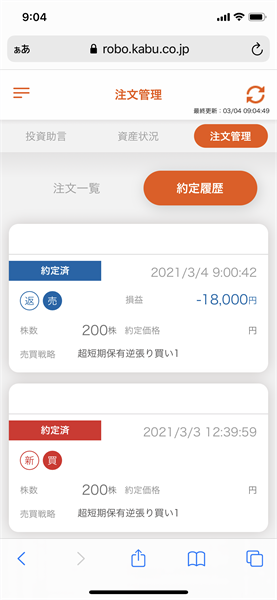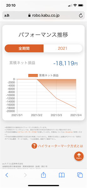信用ロボアド【auカブコム証券】の運用結果(2021年3月4日:デイリー)初陣は、あえなく損切り・・・