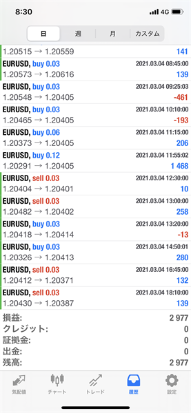 2021年3月4日のFX自動売買トレード結果です。通貨ペアはEURUSDです。Lot0.03で運用しています。