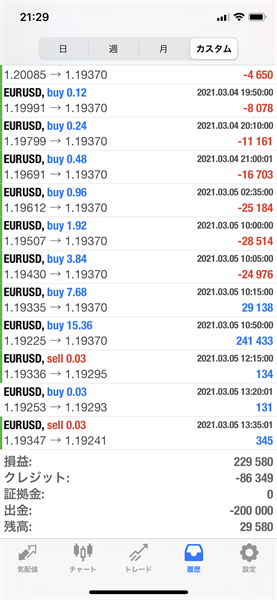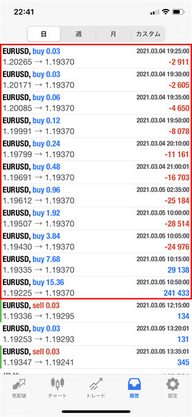 2021年3月1日~3月5日のFX自動売買トレード結果です。通貨ペアはEURUSDです。Lot0.03で運用しています。