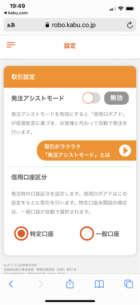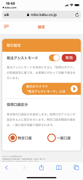 「発注アシストモード」が有効になっている場合、信用ロボアドの売買戦略を基に、自動で売買することができます。