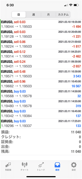 2021年3月11日のFX自動売買トレード結果です。通貨ペアはEURUSDです。Lot0.03で運用しています。