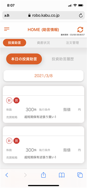 「発注アシストモード」が有効になっている場合、投資助言があった銘柄については、午前8時30分過ぎに自動で注文されます。