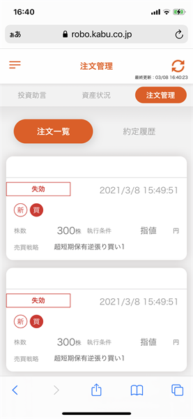 信用ロボアドで注文された銘柄が当日中に約定せず、注文が自動で失効しました