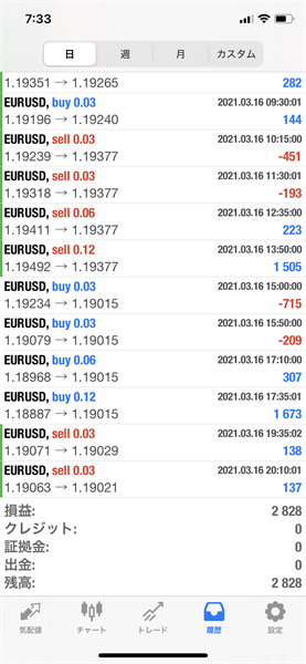 2021年3月16日のFX自動売買トレード結果です。通貨ペアはEURUSDです。Lot0.03で運用しています。