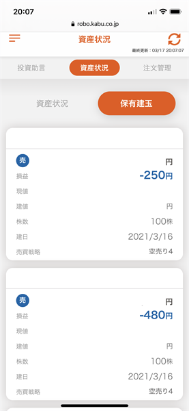 本日の投資助言はありませんでした。昨日に引き続き3銘柄保有状態です。3月16日に約定した2銘柄は若干のマイナス。3月9日に約定した1銘柄は約2.4%下落して、含み益が増えました。