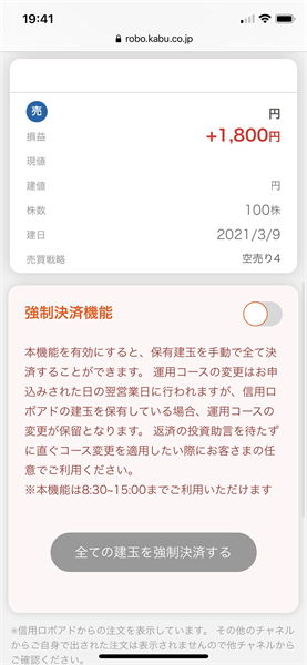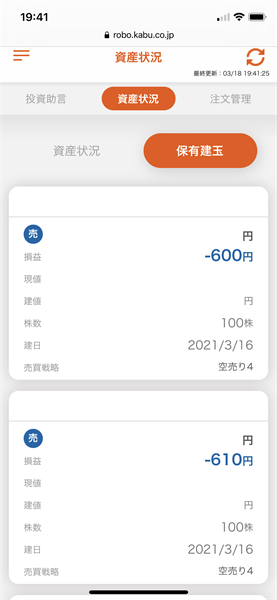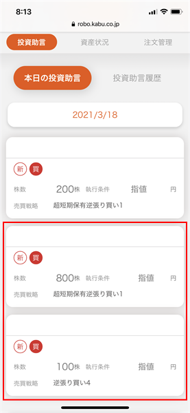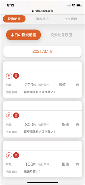 信用ロボアド【auカブコム証券】の運用結果(2021年3月18日:デイリー)3銘柄の投資助言あり。約定せず注文失効。興味深い投資助言でした。