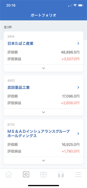 現在保有している銘柄は、[2914]日本たばこ産業・[4502]武田薬品工業・[8725]MS&ADインシュアランスグループHDの3銘柄です。