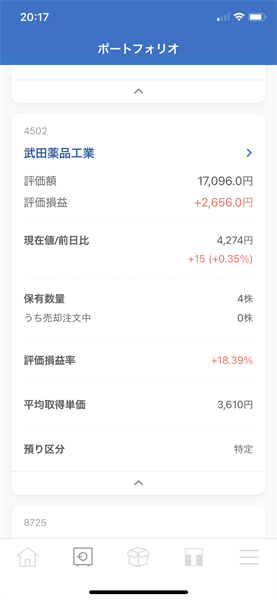 保有している3銘柄は順調に上昇しています。特に、[4502]武田薬品工業は、購入時から約20%近く上昇しています。