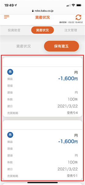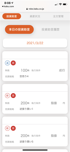 信用ロボアド【auカブコム証券】の運用結果(2021年3月22日:デイリー)5銘柄の投資助言あり。3銘柄約定、1銘柄は利益確定!初めての利益確定です!