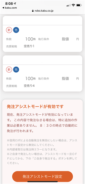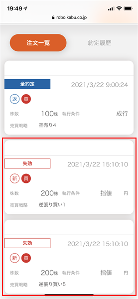 売り銘柄は、「空売り1」「空売り4」の売買戦略で、指値は一緒です。売り銘柄は約定しました。