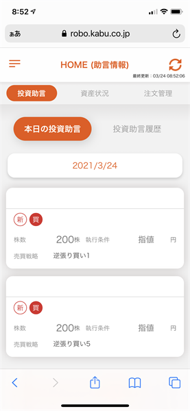 今日、投資助言された銘柄は、3月22日、3月23日に助言された銘柄と同じです。指値の金額は3月23日と同じでした。どうしても買いたい銘柄なのかな・・・