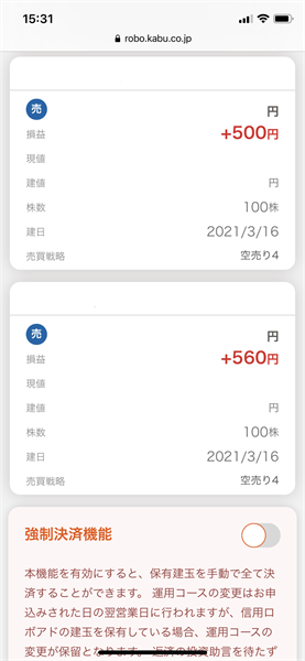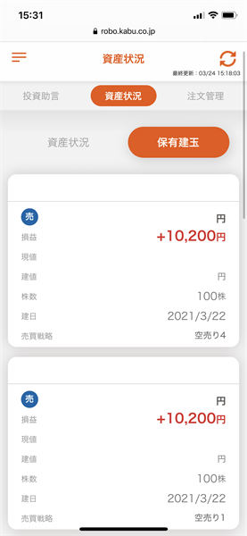信用ロボアド【auカブコム証券】の運用結果(2021年3月24日:デイリー)2銘柄の投資助言あり。約定せず注文失効。累積ネット損益が初めてプラスに!!!