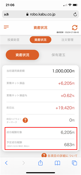 2021年3月24日のauカブコム証券信用ロボアド運用結果です。運用コースは100万円積極型です。