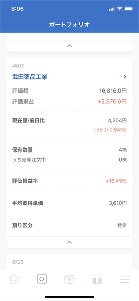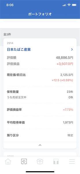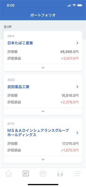 現在保有している銘柄は、[2914]日本たばこ産業・[4502]武田薬品工業・[8725]MS&ADインシュアランスグループHDの3銘柄です。