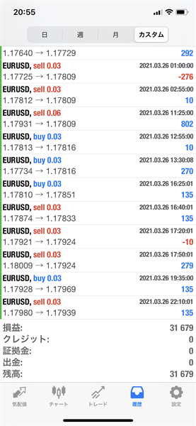 2021年3月22日~3月26日のFX自動売買トレード結果です。通貨ペアはEURUSDです。Lot0.03で運用しています。