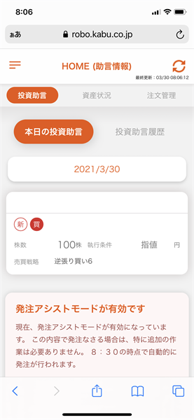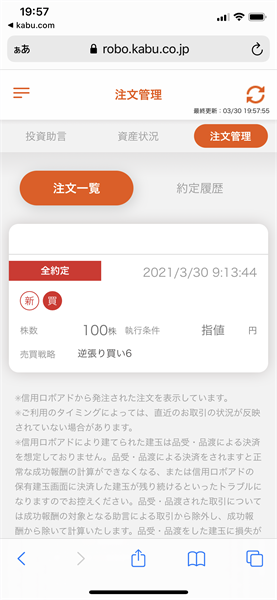信用ロボアド【auカブコム証券】の運用結果(2021年3月30日:デイリー)1銘柄の投資助言あり。1銘柄約定。サポートに問合せ中です。→解決しました!