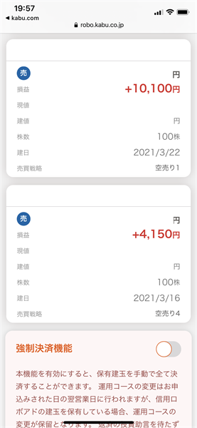 その銘柄は、メール通りに約定していればマイナスなのですが、信用ロボアドのサイトでは、現在も保有状態で含み益になっています。