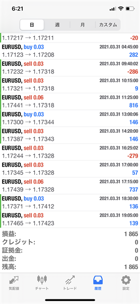 2021年3月31日のFX自動売買トレード結果です。通貨ペアはEURUSDです。Lot0.03で運用しています。