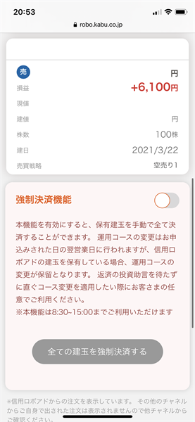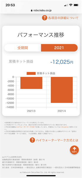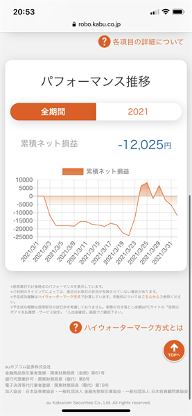 信用ロボアド【auカブコム証券】の運用結果(2021年4月1日:デイリー)投資助言なし。含み益が減っていく・・・