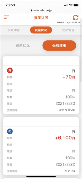 本日の投資助言はなく、3銘柄保有のままです。3月22日に約定した銘柄の含み益が減少しています。