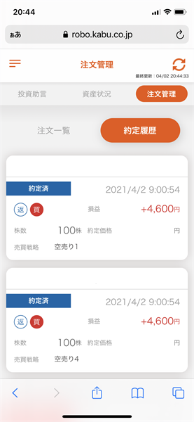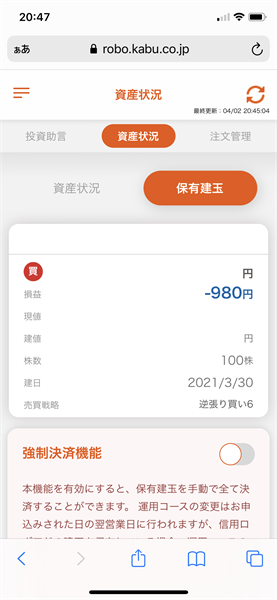 信用ロボアド【auカブコム証券】の運用結果(2021年4月2日:デイリー)2銘柄の投資助言あり。2銘柄利益確定!売買戦略の違いは分からず。