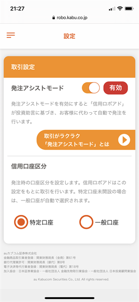 個別株と違って、ほぼほったらかしなのが、auカブコム証券の信用ロボアドとFX自動売買です。auカブコム証券の信用ロボアドは「発注アシストモード」が有効になっているので、日々、信用ロボアドのホームページを見て資産状況をチェックするだけで済みます。