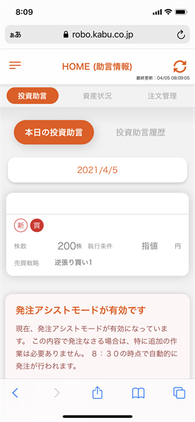 信用ロボアド【auカブコム証券】の運用結果(2021年4月5日:デイリー)1銘柄の投資助言あり。約定せず失効。保有している銘柄が再び投資助言された。