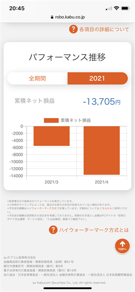 2021年4月5日のauカブコム証券信用ロボアド運用結果です。運用コースは100万円積極型です。