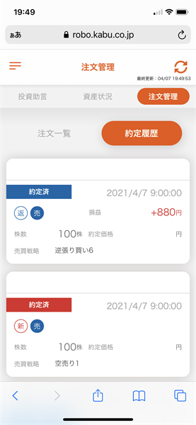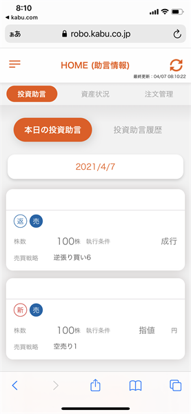 信用ロボアド【auカブコム証券】の運用結果(2021年4月7日:デイリー)2銘柄の投資助言あり。2銘柄約定。1銘柄は利益確定!
