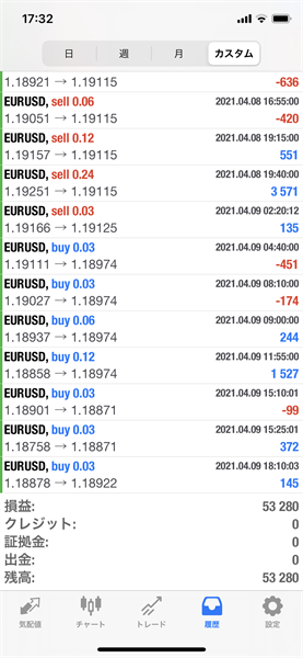 2021年4月5日~4月9日のFX自動売買トレード結果です。通貨ペアはEURUSDです。Lot0.03で運用しています。
