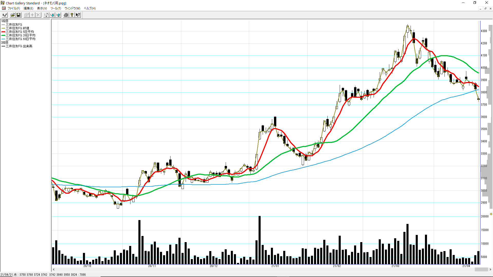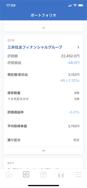 2021年4月21日に三井住友FG[8316]をSBIネオモバイル証券で6株購入しました。約定単価は3,750円で購入金額は22,500円でした。