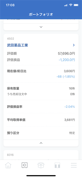 武田薬品工業[4502]が含み損になりました。3月下旬には4,300円を超えていたのですが、3,600円まで下落してしまいました。現在の配当利回りが約4.9%なので、さらに下落したら買い増しする予定です。