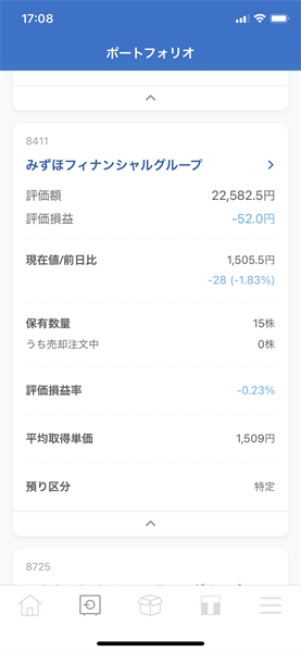 2021年4月21日にみずほFG[8411]をSBIネオモバイル証券で15株購入しました。約定単価は1,509円で購入金額は22,635円でした。
