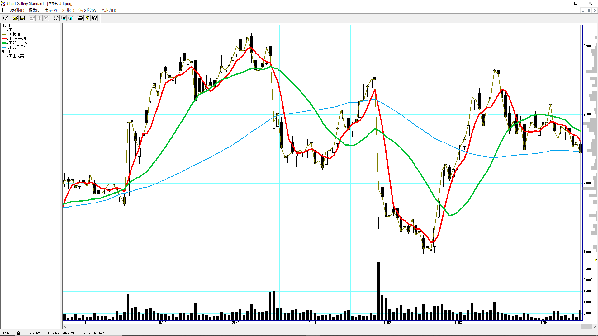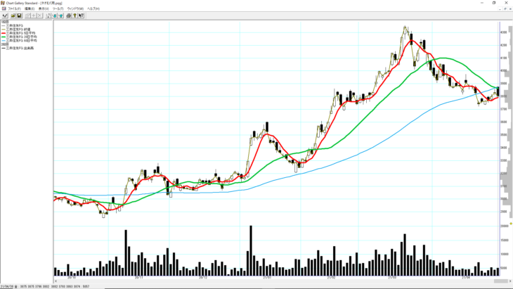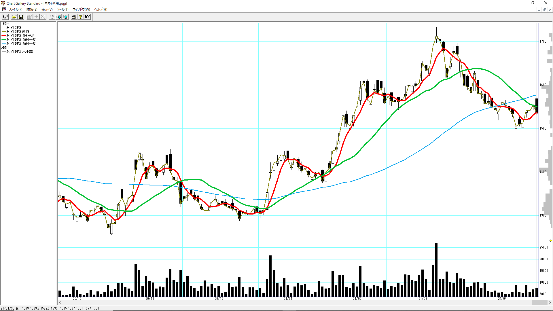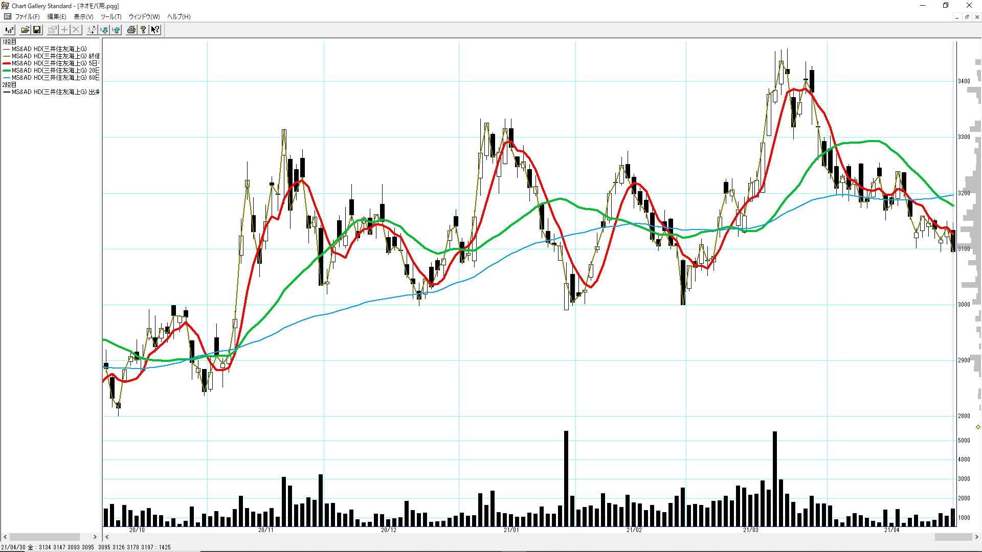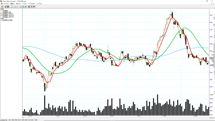 4月は、3月に比べて含み益が減少しています。保有している銘柄のチャートを見てみると、いずれも下落傾向です。日本個別株の運用結果(2021年3月:マンスリー)株価が高値で推移していて買い増しができない・・・