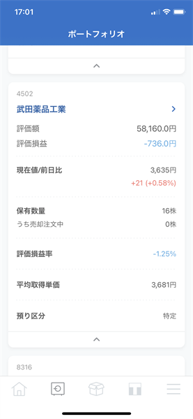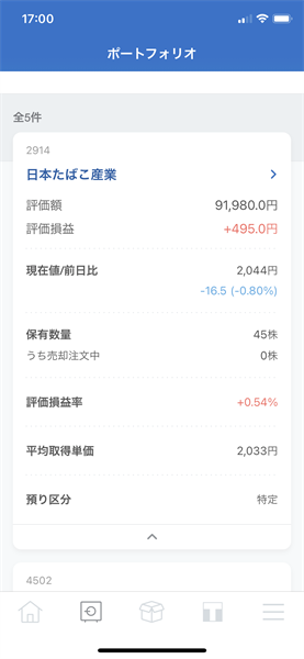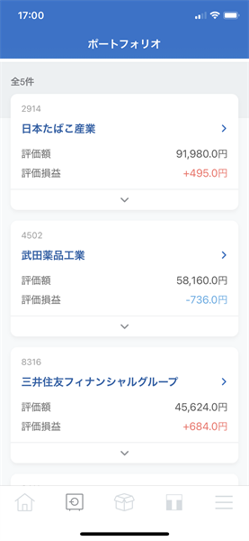 2021年4月の日本個別株の運用結果です。現在保有している銘柄は、[2914]日本たばこ産業・[4502]武田薬品工業・[8725]MS&ADインシュアランスグループHD・[8316]三井住友フィナンシャルグループ・[8411]みずほフィナンシャルグループの5銘柄です。