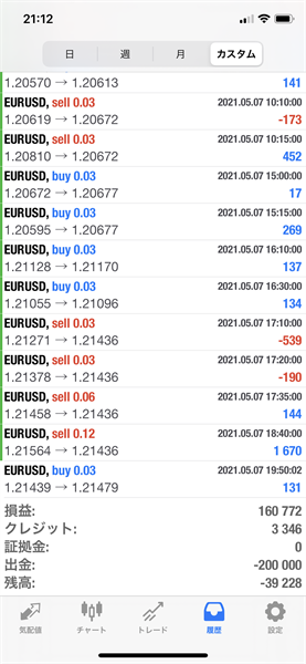 2021年5月3日~5月7日のFX自動売買トレード結果です。通貨ペアはEURUSDです。Lot0.03で運用しています。