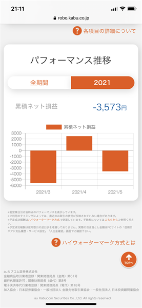 信用ロボアド【auカブコム証券】の運用結果(2021年5月3日~5月7日:ウィークリー)買い1銘柄損切りで、累計ネット損益は再びマイナス。一進一退が続く。