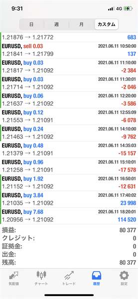 2021年6月7日~6月11日のFX自動売買トレード結果です。通貨ペアはEURUSDです。Lot0.03で運用しています。