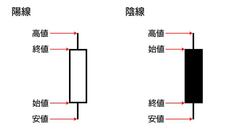 ローソク足は「陽線」と「陰線」の2種類あり、始値よりも終値が高い場合を「陽線」、始値より終値が安い場合を「陰線」と言います。