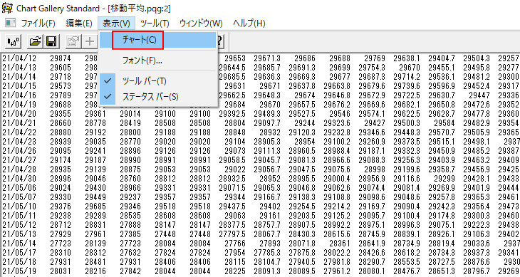 チャートギャラリーでローソク足を表示する方法です。通常であれば、チャートビューアのボタンをクリックすると、チャートギャラリーが起動されて、ローソク足チャートが表示されます。