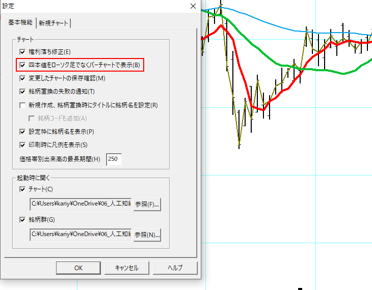 【四本値をローソク足でなくバーチャートで表示】のチェックを外します。