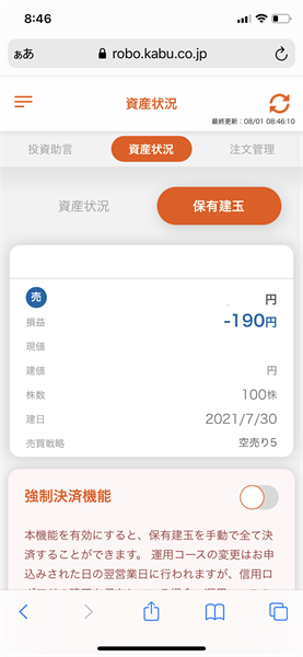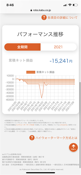 信用ロボアド【auカブコム証券】の運用結果(2021年7月:マンスリー)200万円積極型の信用ロボアドは7月は無風状態