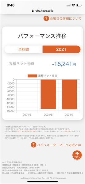 2021年7月のauカブコム証券信用ロボアド運用結果です。運用コースは200万円積極型です。