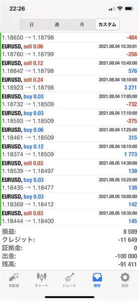 2021年8月2日~8月6日のFX自動売買トレード結果です。通貨ペアはEURUSDです。Lot0.03で運用しています。