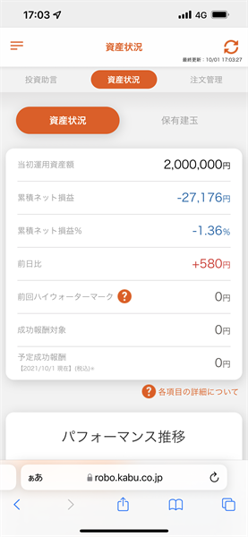 2021年9月のauカブコム証券信用ロボアド運用結果です。運用コースは200万円積極型です。
