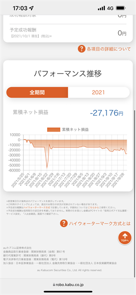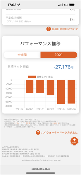 信用ロボアド【auカブコム証券】の運用結果(2021年9月:マンスリー)投資助言の数は増えたが、成績が悪い。
