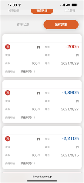 9月に入ってから、投資助言の数が増えました。以前は指値注文が多かったのですが、最近は成行注文なので、投資助言が出れば約定する状況が続いています。