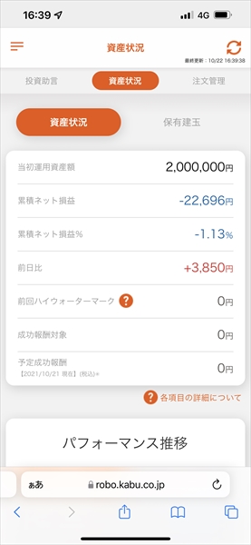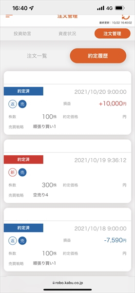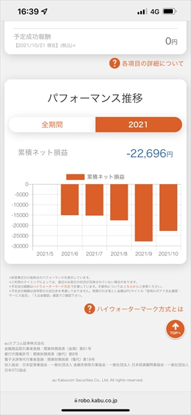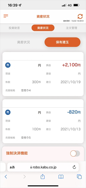 2021年10月18日~10月22日のauカブコム証券の信用ロボアド運用結果です。運用コースは200万円積極型です。